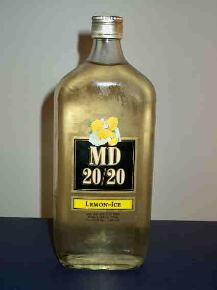 So this is it, MD 20/20 #1. It tastes like a lemon air freshner. It looked so good to me a little while ago. It smells and tastes like a shitty white zinfandel mixed with rubbing alcohol. Little taste or smell of lemon. I think that things like this that are lemon flavored are destined to be bad. I'm not dissuaded to try others, I still want to get a nice non-lemon bastard a try. AK brought up a very good point to me regarding this one: what is the flavor of ice, anyways?